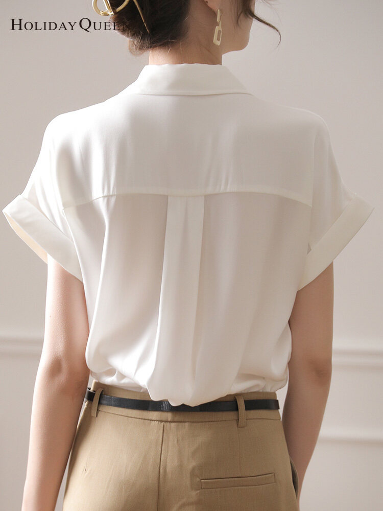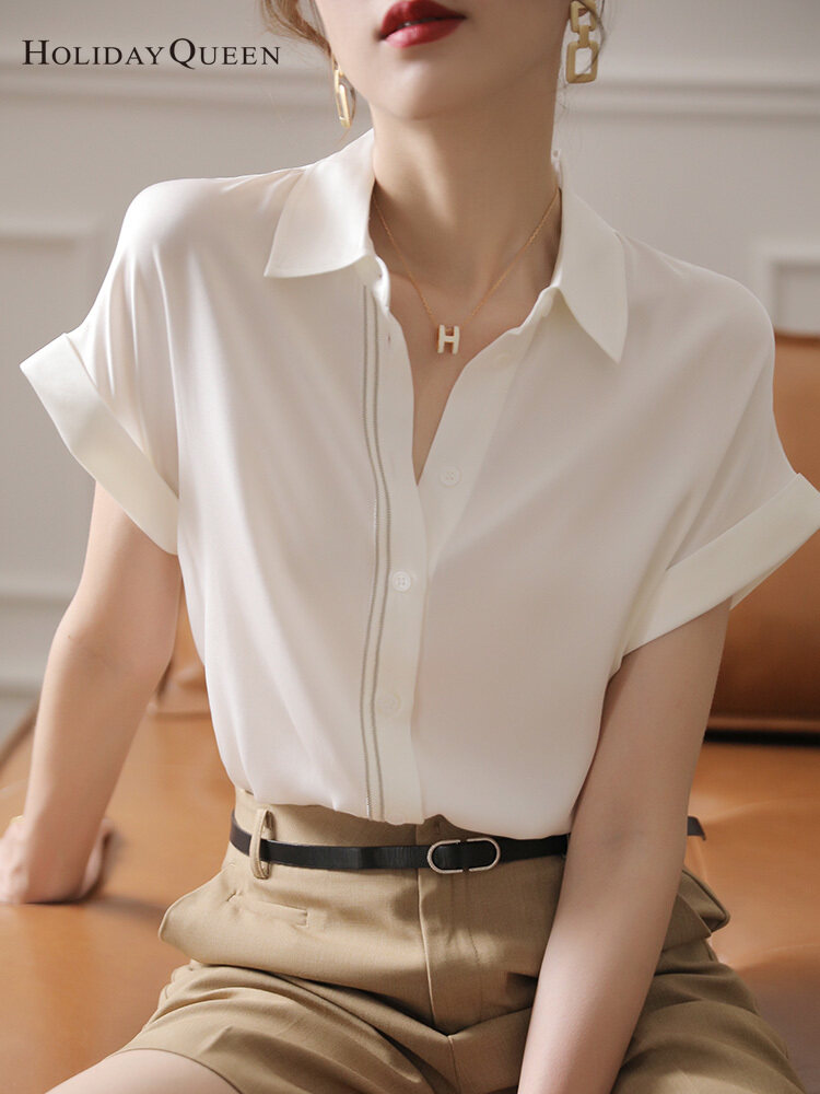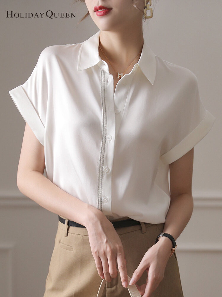 HOLIDAYQUEEN White Silk Shirt Women's Summer Short-sleeved Loose Mulberry Silk Top High-end Big-name Temperament High-end White Shirt Women HQ1536
